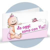Bigliettini di bomboniera in cartoncino bianco prefustellati in f.to A4, stampa su fronte a colori di una bimba con cartello con su scritto "Da oggi sono con voi", ideale per nascita femminuccia. Minimo d'ordine 20 pz, ordinabili in multipli di 20 pz.