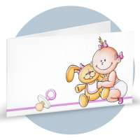 Bigliettini di bomboniera in cartoncino bianco prefustellati in f.to A4, stampa su fronte a colori di una bimba abbracciata al peluche, ideale per nascita femminuccia. Minimo d'ordine 20 pz, ordinabili in multipli di 20 pz.