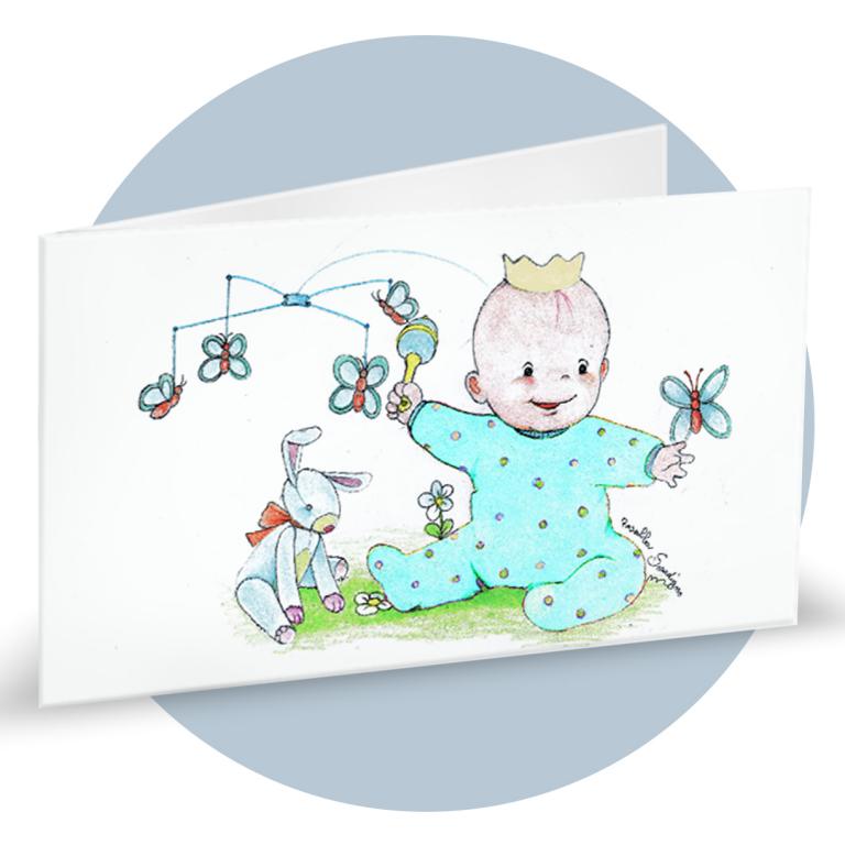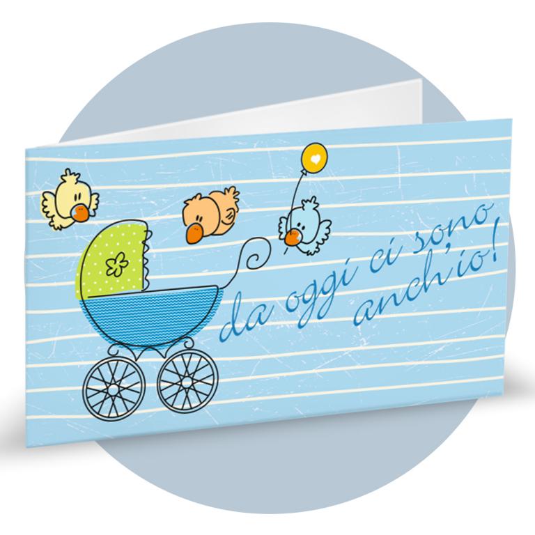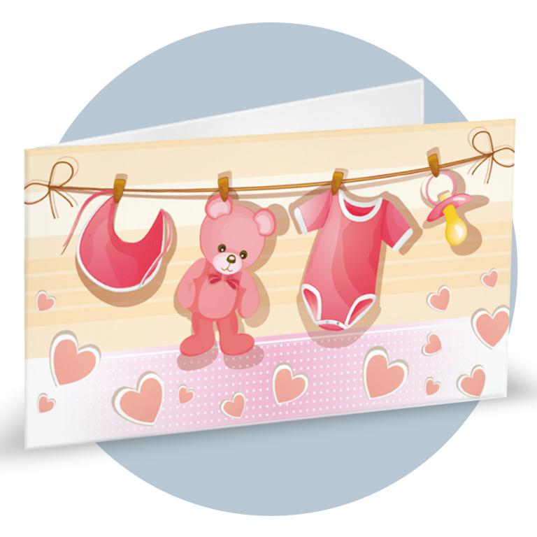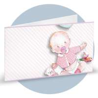 Bigliettini di bomboniera in cartoncino bianco prefustellati in f.to A4, stampa su fronte a colori di una bimba con ciuccio, ideale per nascita femminuccia. Minimo d'ordine 20 pz, ordinabili in multipli di 20 pz.