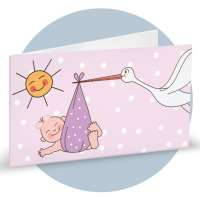 Bigliettini di bomboniera in cartoncino bianco prefustellati in f.to A4, stampa su fronte a colori di una cicogna con bimba in fasce su sfondo a pois rosa, ideale per nascita femminuccia. Minimo d'ordine 20 pz, ordinabili in multipli di 20 pz.
