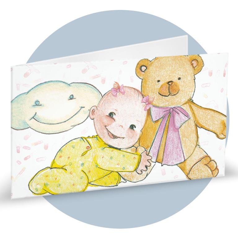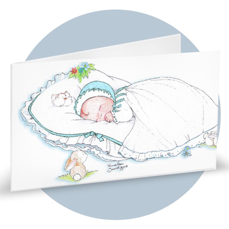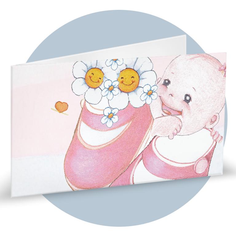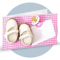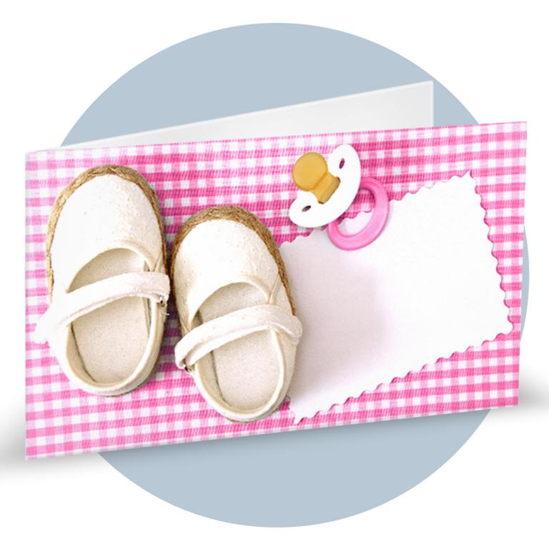 Bigliettini di bomboniera in cartoncino bianco prefustellati in f.to A4, stampa su fronte a colori di scarpette e ciuccio su sfondo quadrettato rosa, personalizzabile con il nome della bimba, ideale per nascita femminuccia. Minimo d'ordine 20 pz, ordinabili in multipli di 20 pz.