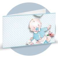 Bigliettini di bomboniera in cartoncino bianco prefustellati in f.to A4, stampa su fronte a colori di un bimbo con ciuccio, ideale per nascita maschietto. Minimo d'ordine 20 pz, ordinabili in multipli di 20 pz.