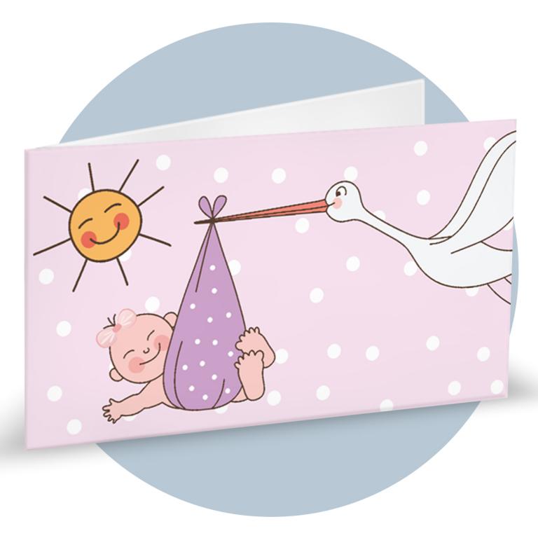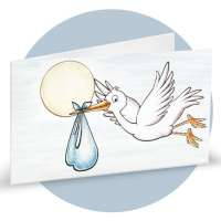Bigliettini di bomboniera in cartoncino bianco prefustellati in f.to A4, stampa su fronte a colori di una cicogna con bimbo in fasce, ideale per nascita maschietto. Minimo d'ordine 20 pz, ordinabili in multipli di 20 pz.