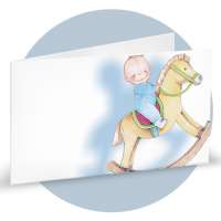 Bigliettini di bomboniera in cartoncino bianco prefustellati in f.to A4, stampa su fronte a colori di un bimbo sul cavallo a dondolo, ideale per nascita maschietto. Minimo d'ordine 20 pz, ordinabili in multipli di 20 pz.