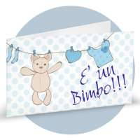 Bigliettini di bomboniera in cartoncino bianco prefustellati in f.to A4, stampa su fronte a colori di un peluche, maglietta, calzini e cuoricino stesi su di un filo , ideale per nascita maschietto. Minimo d'ordine 20 pz, ordinabili in multipli di 20 pz.