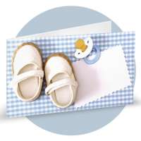 Bigliettini di bomboniera in cartoncino bianco prefustellati in f.to A4, stampa su fronte a colori di scarpette e ciuccio su sfondo quadrettato azzurro, personalizzabile con il nome del bimbo, ideale per nascita maschietto. Minimo d'ordine 20 pz, ordinabili in multipli di 20 pz.