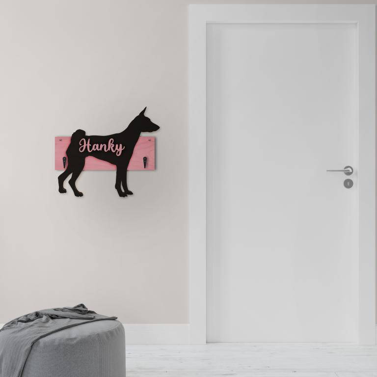 Porta guinzaglio razza cane Basenji personalizzato con il nome del tuo cane. Base: legno 6mm, sagoma razza legno 4mm e nome cane legno 6 mm. Sono disponibili diverse varianti di colori quali: