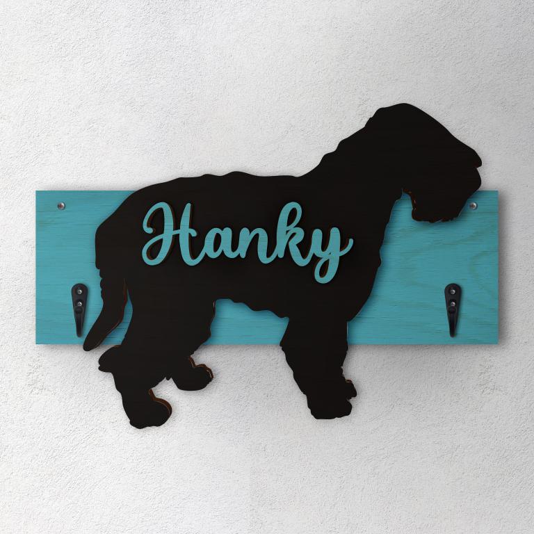 Porta guinzaglio razza cane Wheaten terrier personalizzato con il nome del tuo cane. Base: legno 6mm, sagoma razza legno 4mm e nome cane legno 6 mm. Sono disponibili diverse varianti di colori quali: Variante A base Nero - Cane Legno - Nome nero Variante B base Legno - Cane Nero - Nome Legno Variante C base Legno - Cane Nero - Nome Blu Variante D base Blu - Cane Nero - Nome Blu Variante E base Rosa - Cane Nero - Nome Rosa