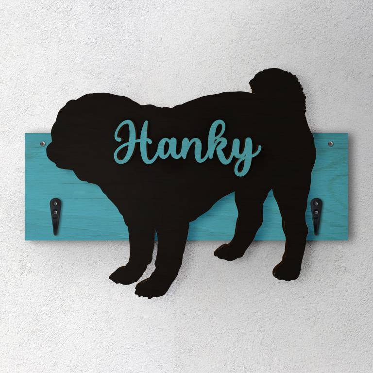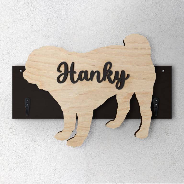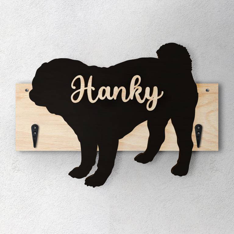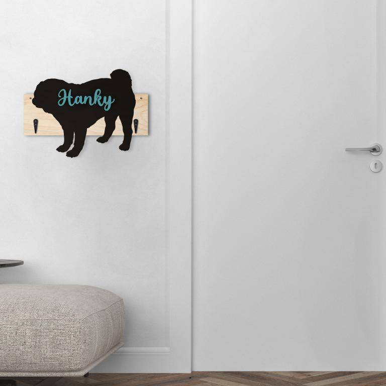 Porta guinzaglio razza cane Carlino personalizzato con il nome del tuo cane. Base: legno 6mm, sagoma razza legno 4mm e nome cane legno 6 mm. Sono disponibili diverse varianti di colori quali: Variante A base Nero - Cane Legno - Nome nero Variante B base Legno - Cane Nero - Nome Legno Variante C base Legno - Cane Nero - Nome Blu Variante D base Blu - Cane Nero - Nome Blu Variante E base Rosa - Cane Nero - Nome Rosa
