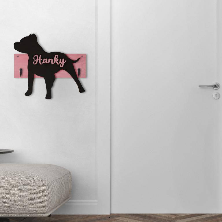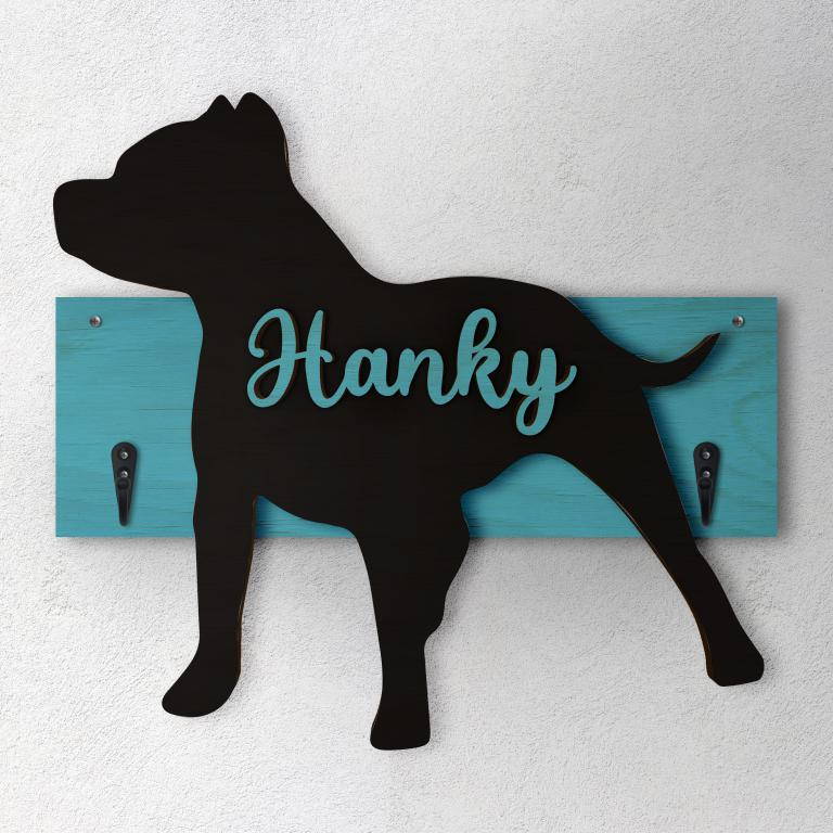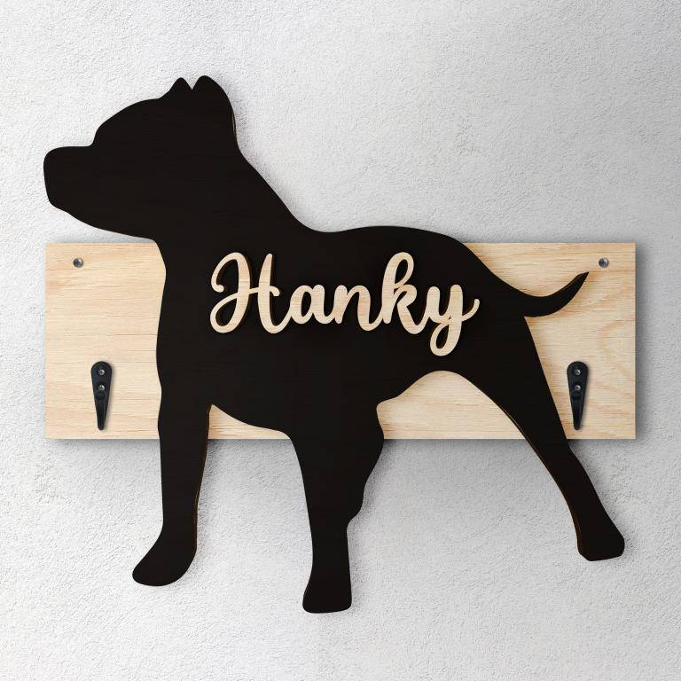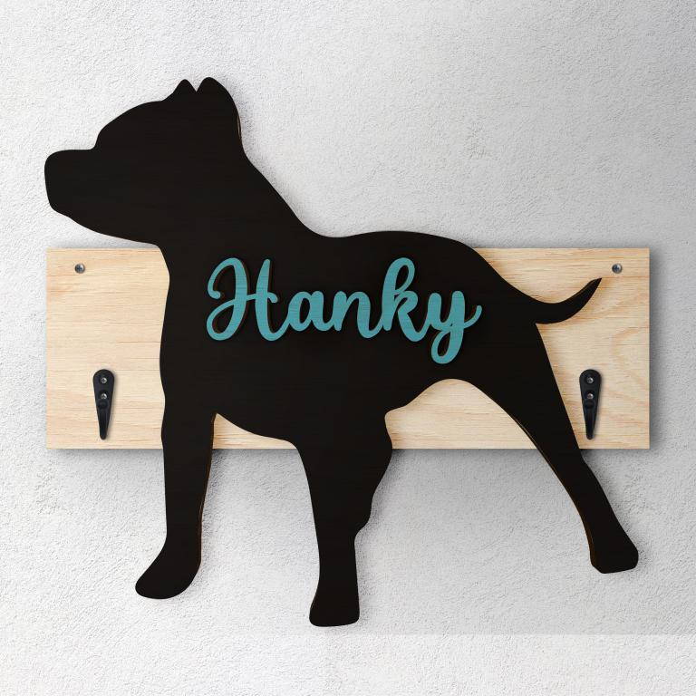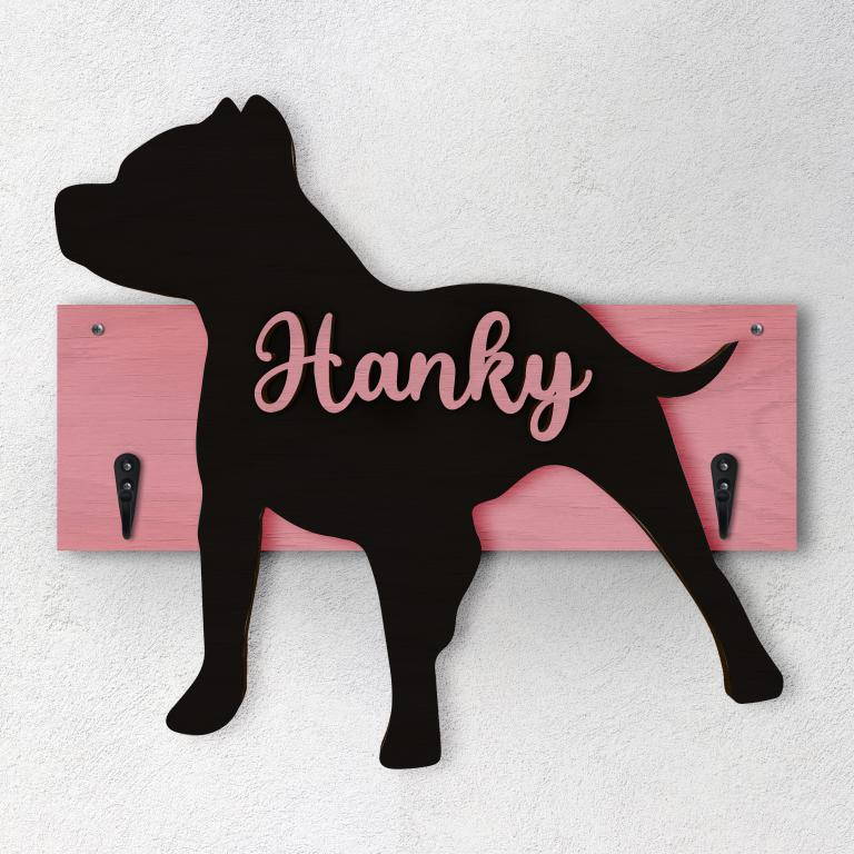 Porta guinzaglio razza cane Pitbull personalizzato con il nome del tuo cane. Base: legno 6mm, sagoma razza legno 4mm e nome cane legno 6 mm. Sono disponibili diverse varianti di colori quali: Variante A base Nero - Cane Legno - Nome nero Variante B base Legno - Cane Nero - Nome Legno Variante C base Legno - Cane Nero - Nome Blu Variante D base Blu - Cane Nero - Nome Blu Variante E base Rosa - Cane Nero - Nome Rosa