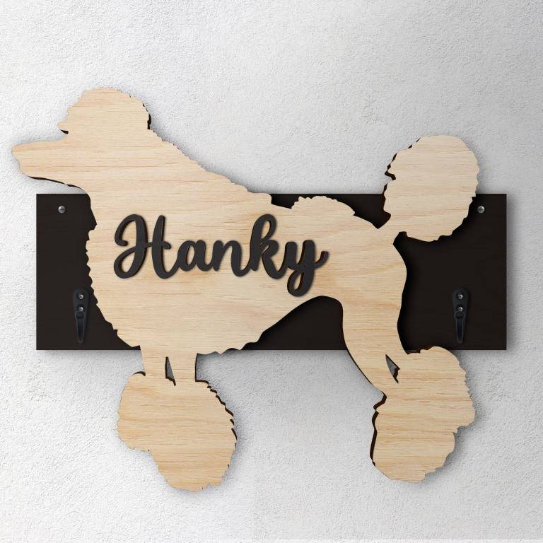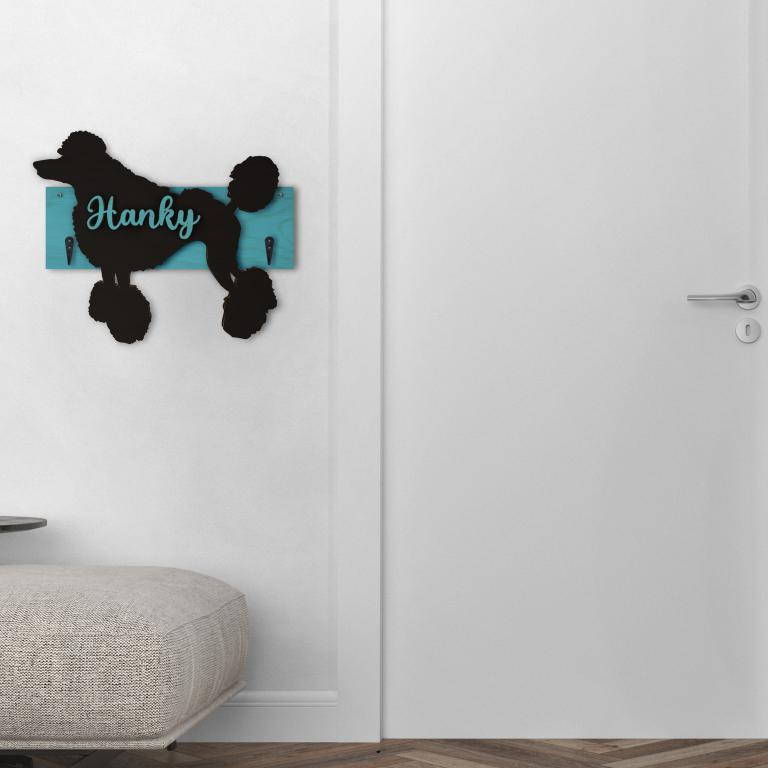 Porta guinzaglio razza cane Barbone grande personalizzato con il nome del tuo cane. Base: legno 6mm, sagoma razza legno 4mm e nome cane legno 6 mm. Sono disponibili diverse varianti di colori quali: Variante A base Nero - Cane Legno - Nome nero Variante B base Legno - Cane Nero - Nome Legno Variante C base Legno - Cane Nero - Nome Blu Variante D base Blu - Cane Nero - Nome Blu Variante E base Rosa - Cane Nero - Nome Rosa