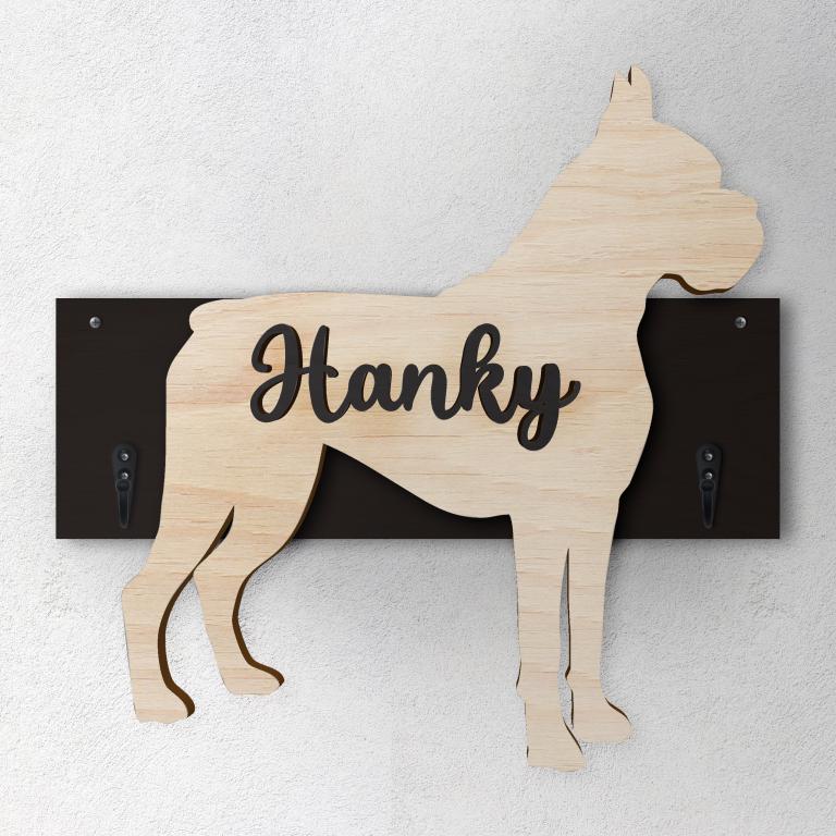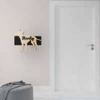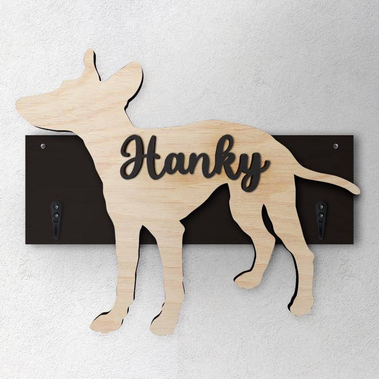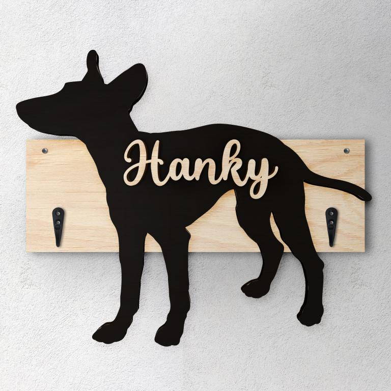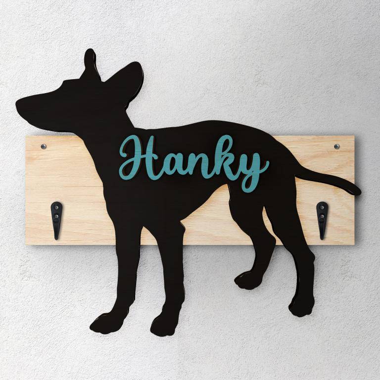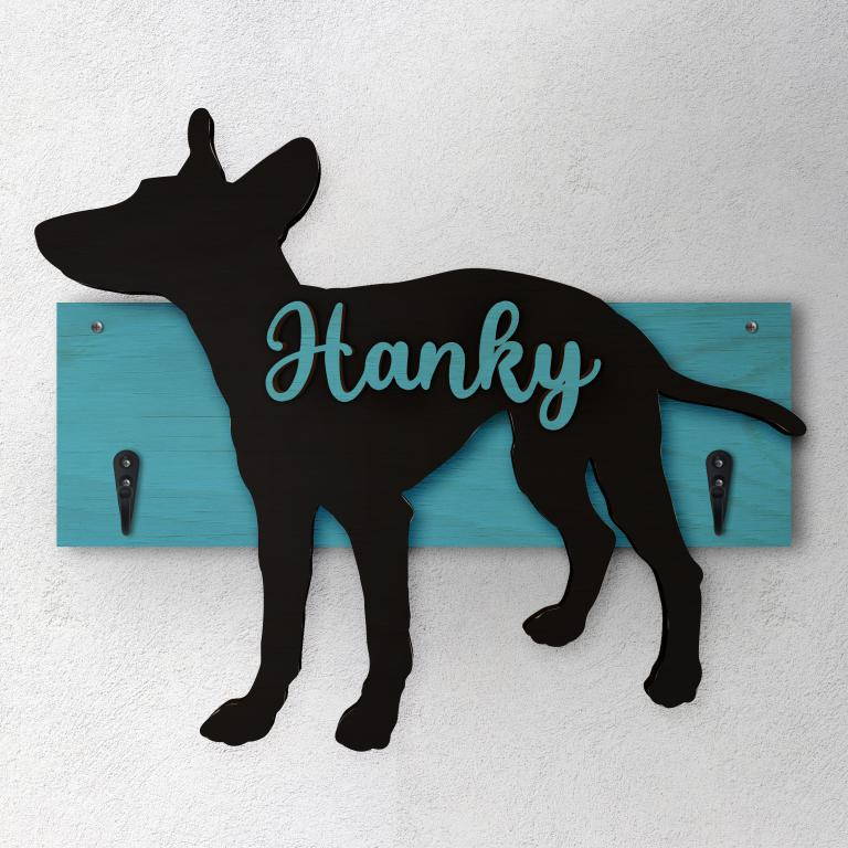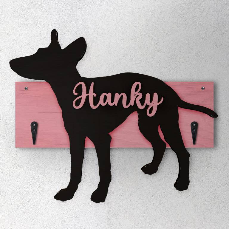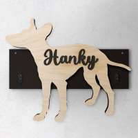 Porta guinzaglio razza cane Cirneco dell'etna personalizzato con il nome del tuo cane. Base: legno 6mm, sagoma razza legno 4mm e nome cane legno 6 mm. Sono disponibili diverse varianti di colori quali: Variante A base Nero - Cane Legno - Nome nero Variante B base Legno - Cane Nero - Nome Legno Variante C base Legno - Cane Nero - Nome Blu Variante D base Blu - Cane Nero - Nome Blu Variante E base Rosa - Cane Nero - Nome Rosa