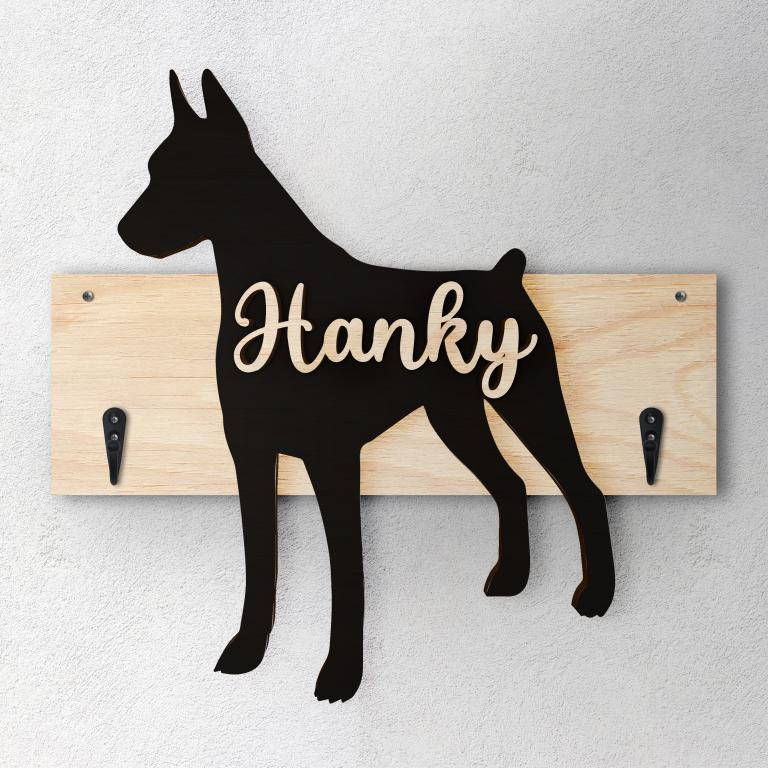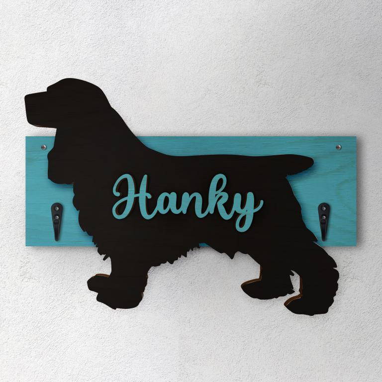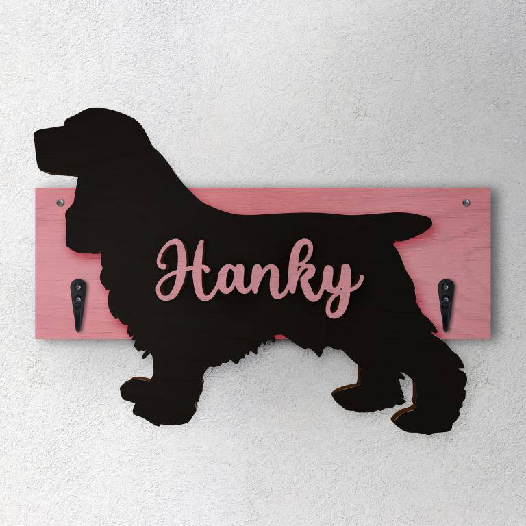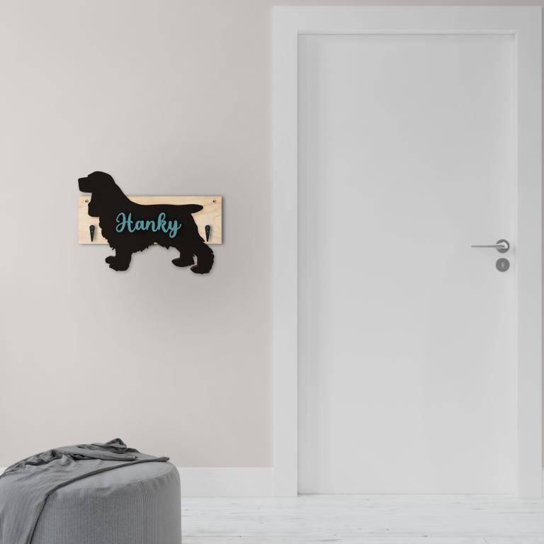 Porta guinzaglio razza cane Cocker personalizzato con il nome del tuo cane. Base: legno 6mm, sagoma razza legno 4mm e nome cane legno 6 mm. Sono disponibili diverse varianti di colori quali: Variante A base Nero - Cane Legno - Nome nero Variante B base Legno - Cane Nero - Nome Legno Variante C base Legno - Cane Nero - Nome Blu Variante D base Blu - Cane Nero - Nome Blu Variante E base Rosa - Cane Nero - Nome Rosa