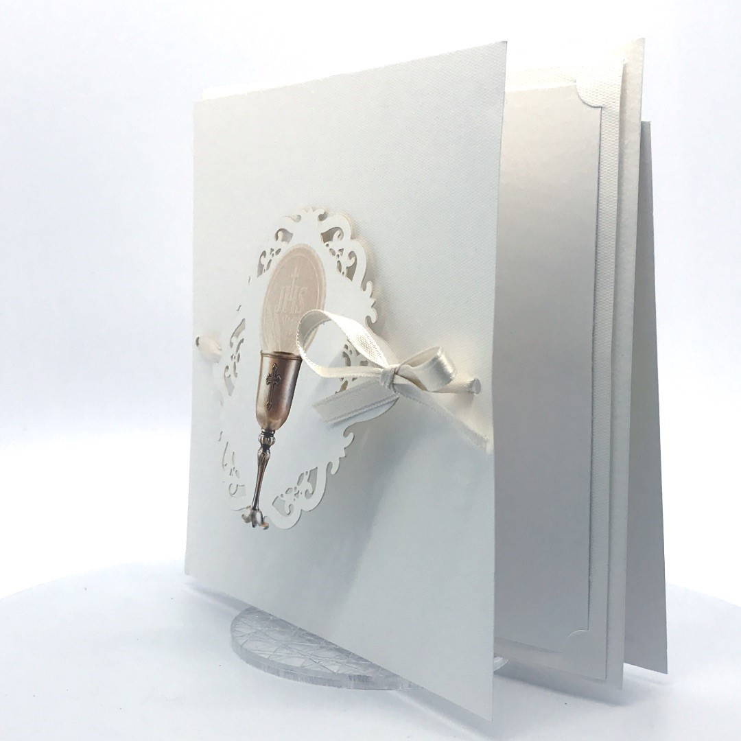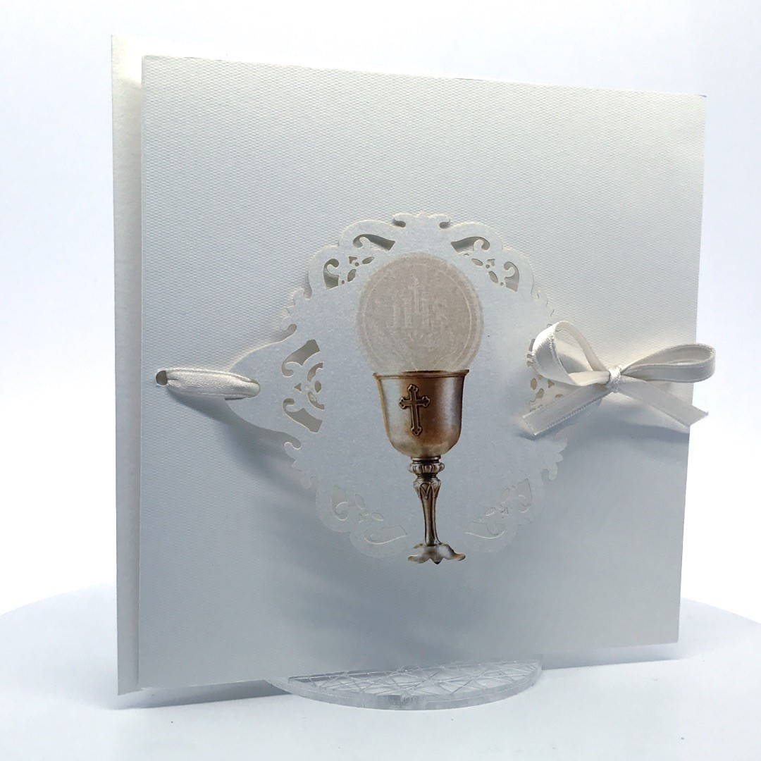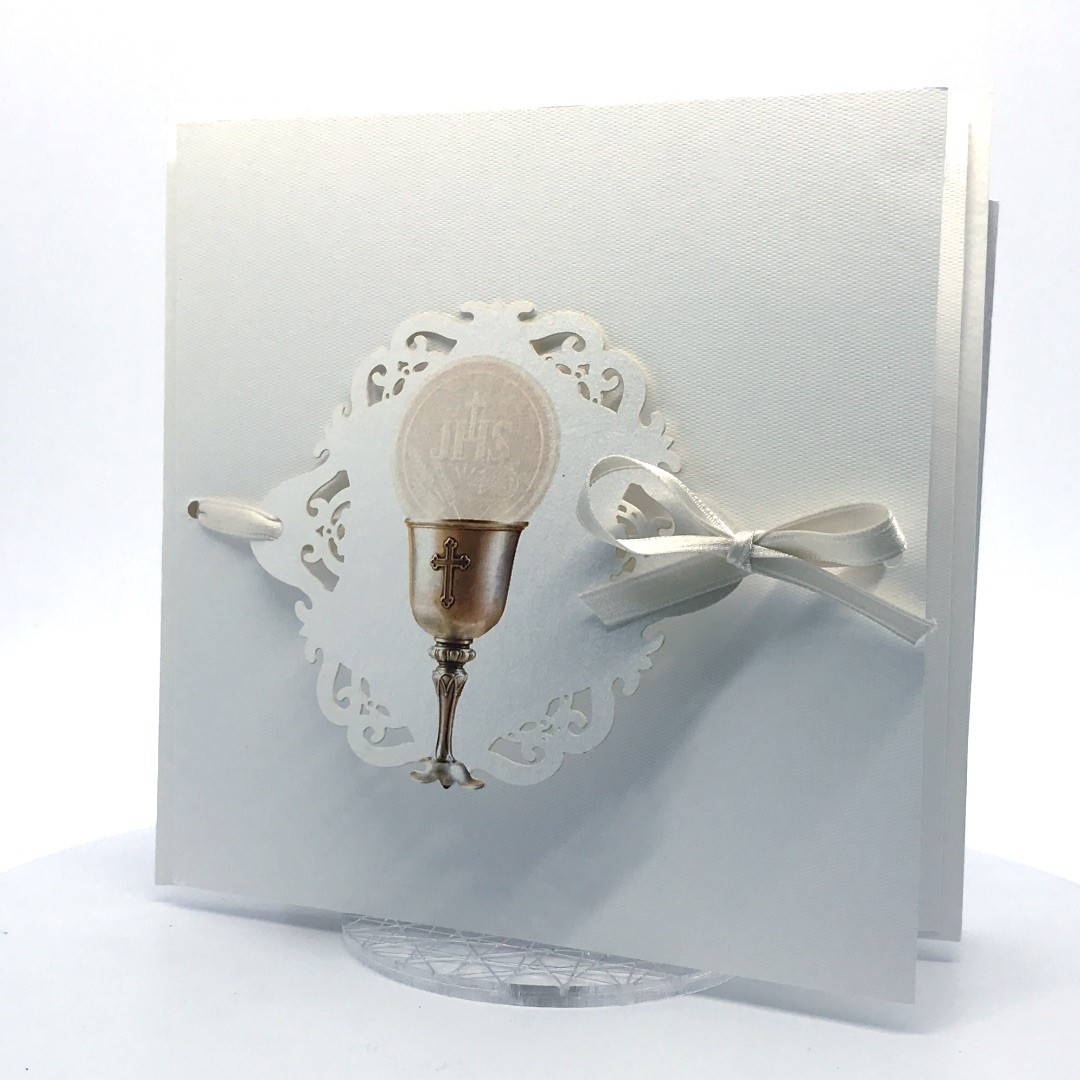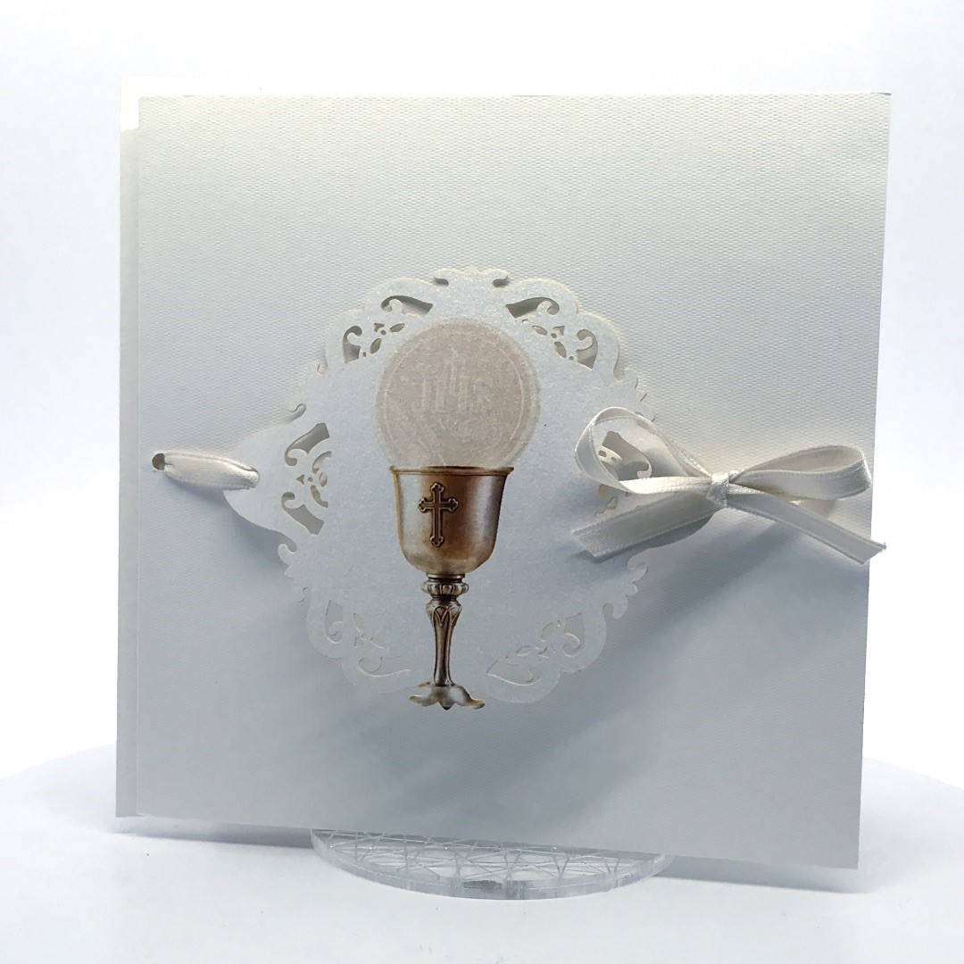 Invito per comunione f.to 15x15 cm chiusa in carta panna tipo cotone,con cartoncino intagliato a laser e disegno del calice, legato alla partecipazione da un nastro in raso colore panna, busta martellata bianca.
