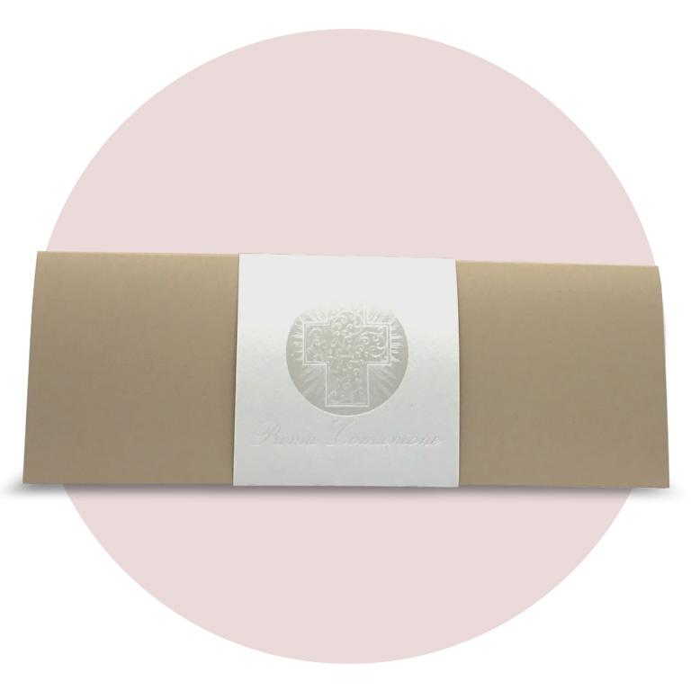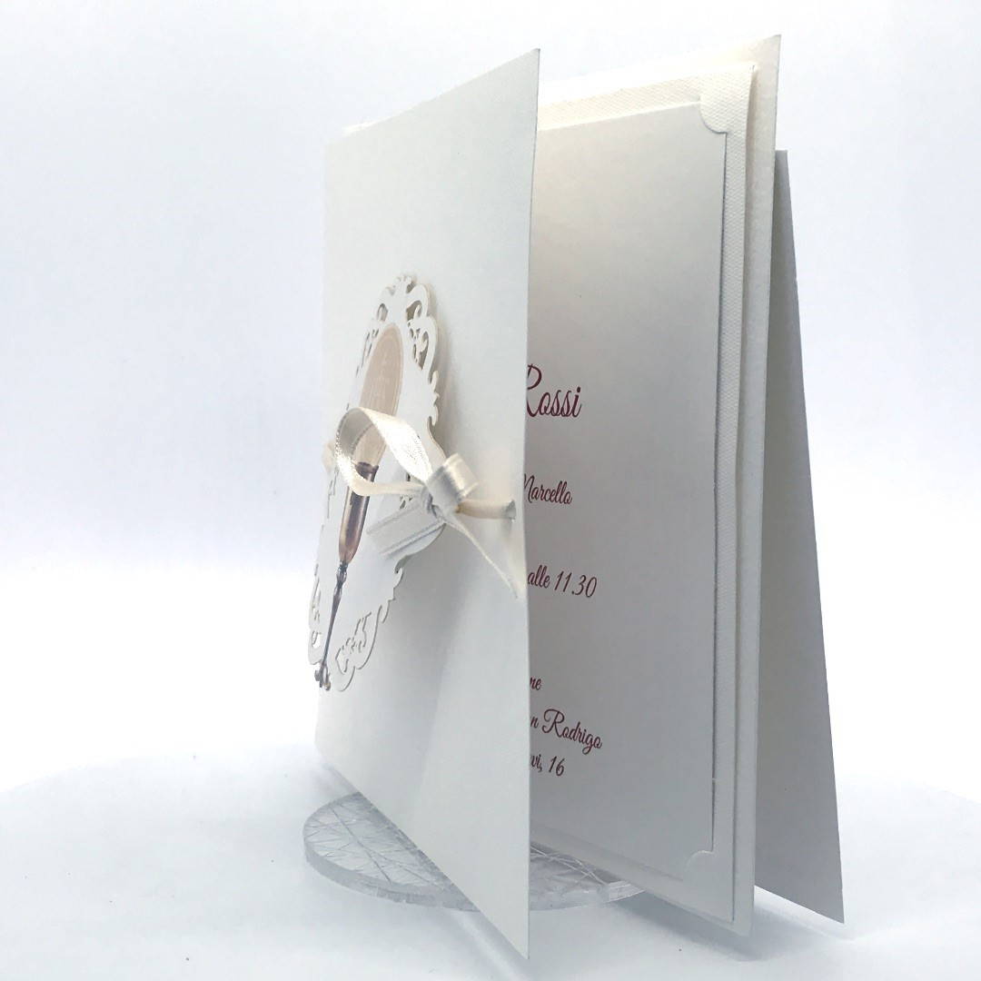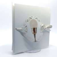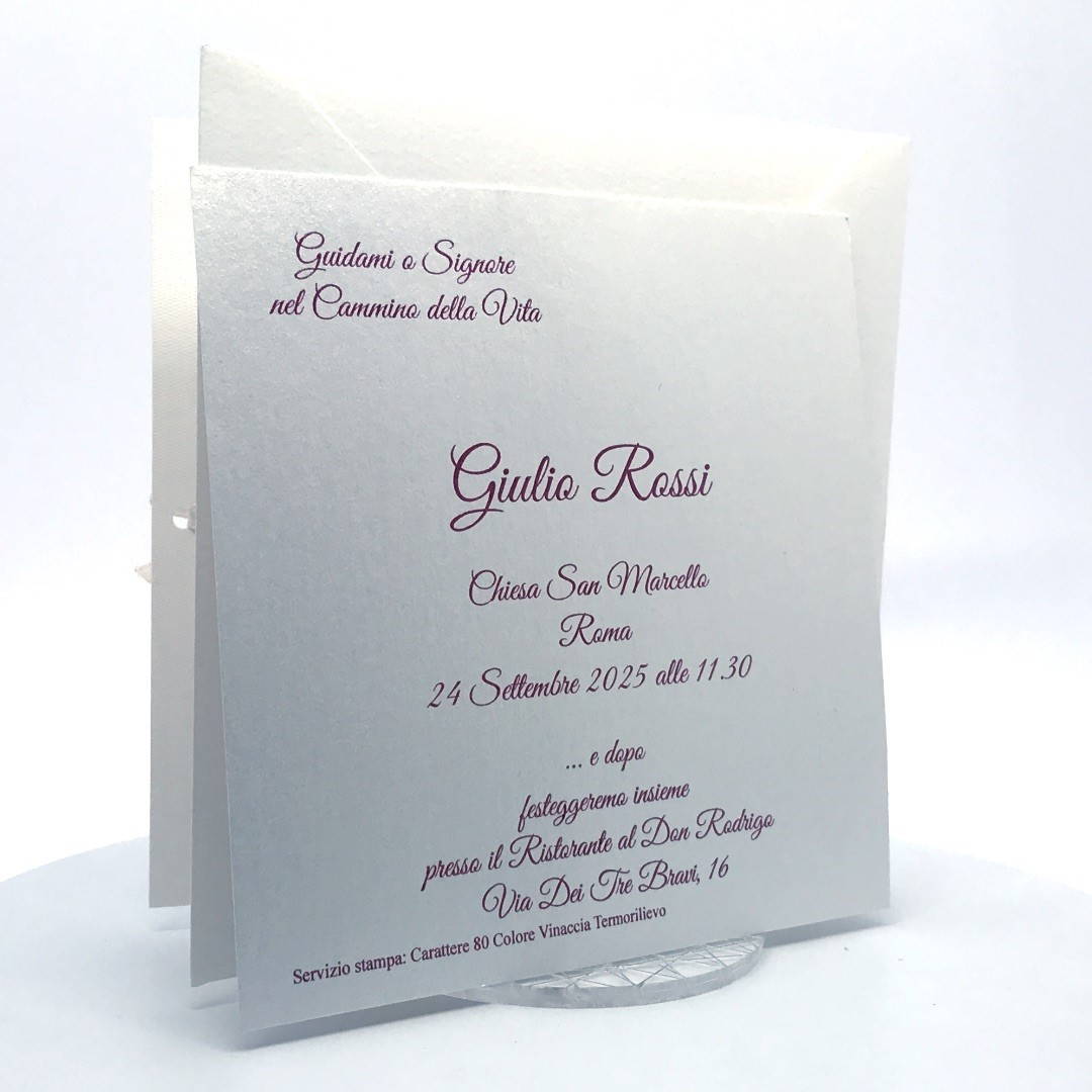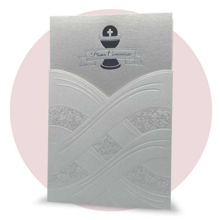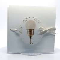 Invito per comunione f.to 15x15 cm chiusa in carta panna tipo cotone,con cartoncino intagliato a laser e disegno del calice, legato alla partecipazione da un nastro in raso colore panna, busta martellata bianca.