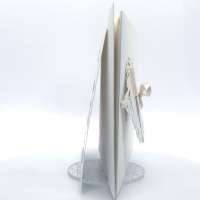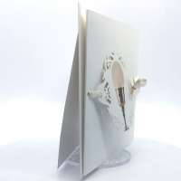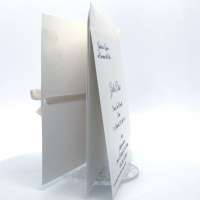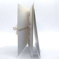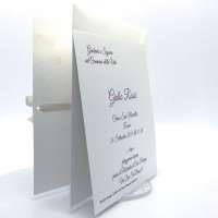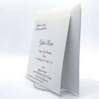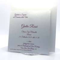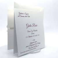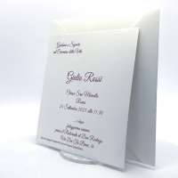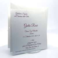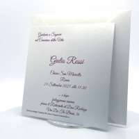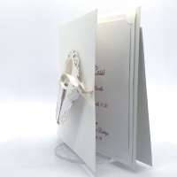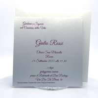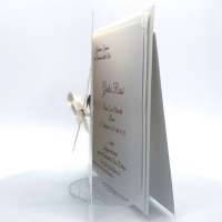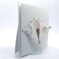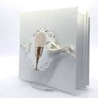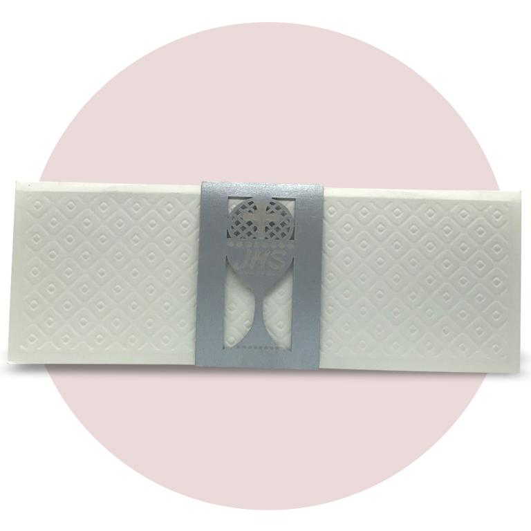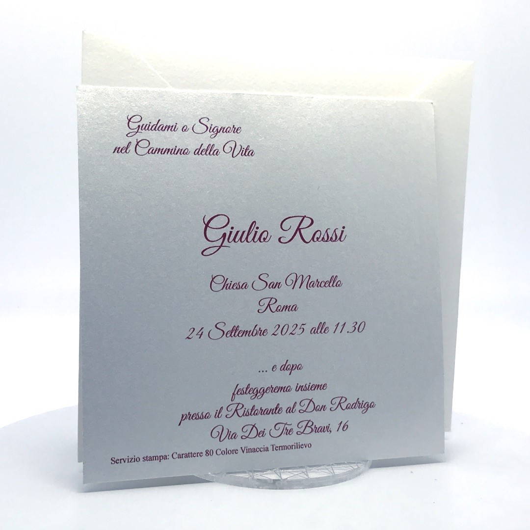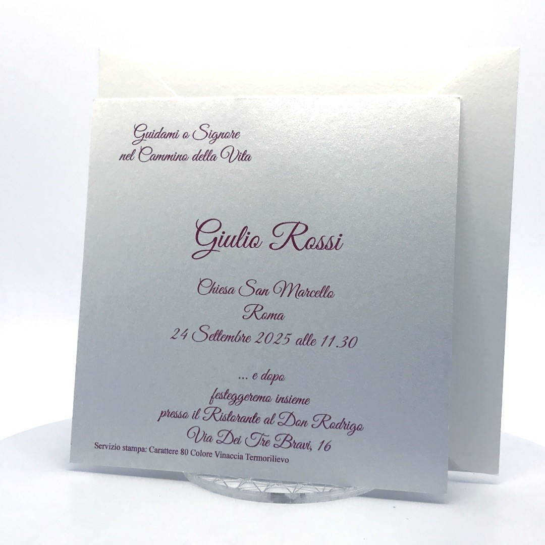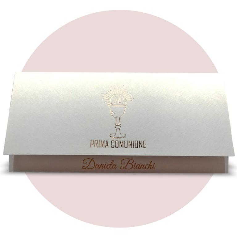 Invito per comunione f.to 15x15 cm chiusa in carta panna tipo cotone,con cartoncino intagliato a laser e disegno del calice, legato alla partecipazione da un nastro in raso colore panna, busta martellata bianca.