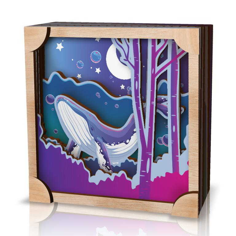 Lampada cameretta tridimensionale personalizzabile con balena volante, in legno multistrato. Stampa applicata e led a basso consumo.