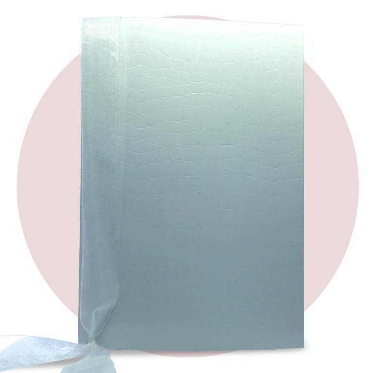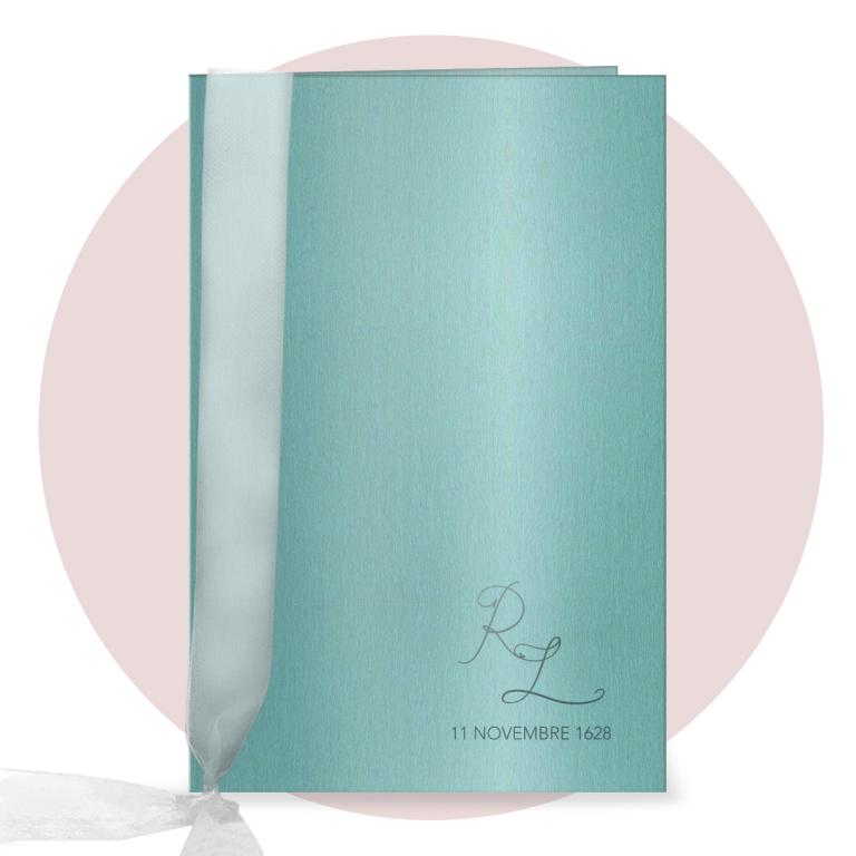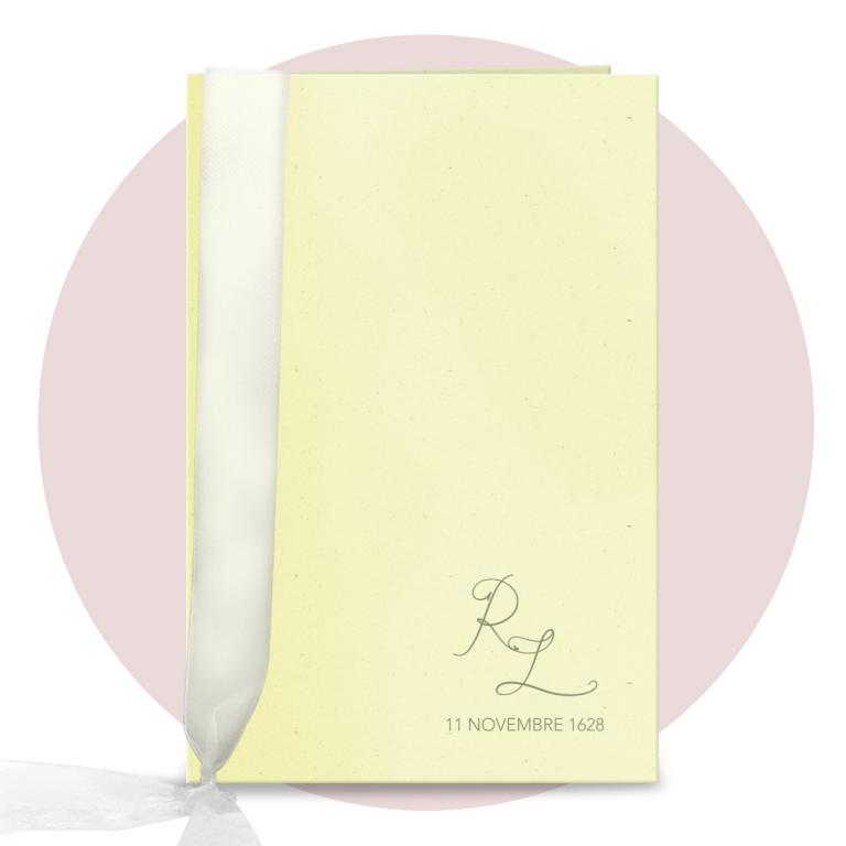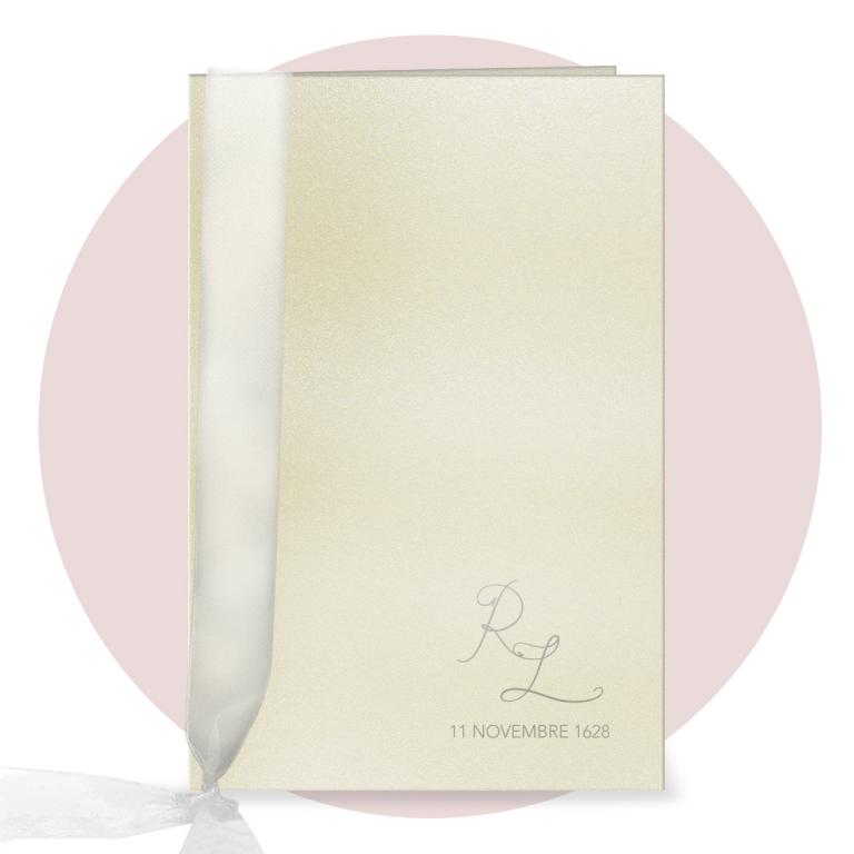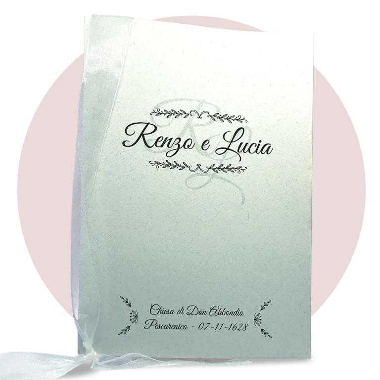 Libretto Messa copertina in cartoncino Acquerello. Il libretto messa èconposto da interno in carta bianca o avorio 90 gr di 16 facciate, spillato. La copertina collegata all'interno per mezzo di un nastro in organza già compreso. La stampa dell'interno è prevista nera, la stampa a colori della copertina è compresa nel prezzo.