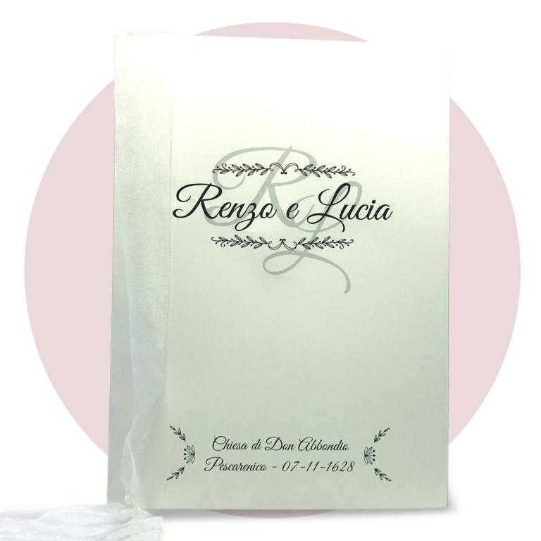 Libretto Messa copertina in cartoncino coccodrillo. Il libretto messa èconposto da interno in carta bianca o avorio 90 gr di 16 facciate, spillato. La copertina collegata all'interno per mezzo di un nastro in organza già compreso. La stampa dell'interno è prevista nera, la stampa a colori della copertina è compresa nel prezzo.