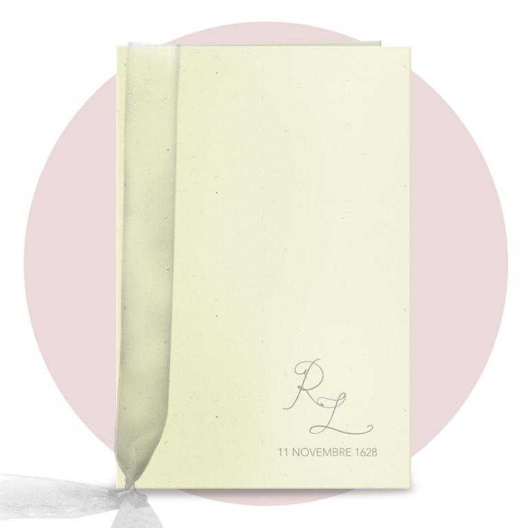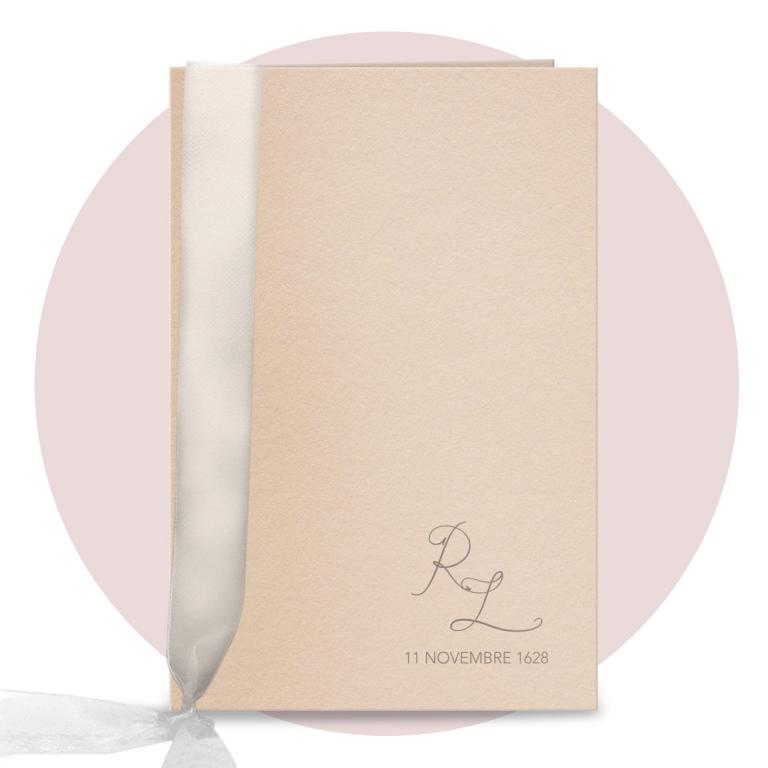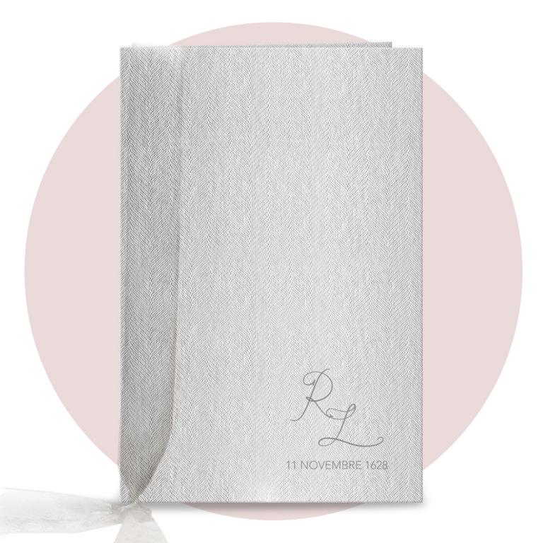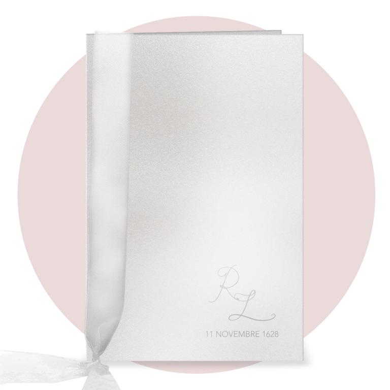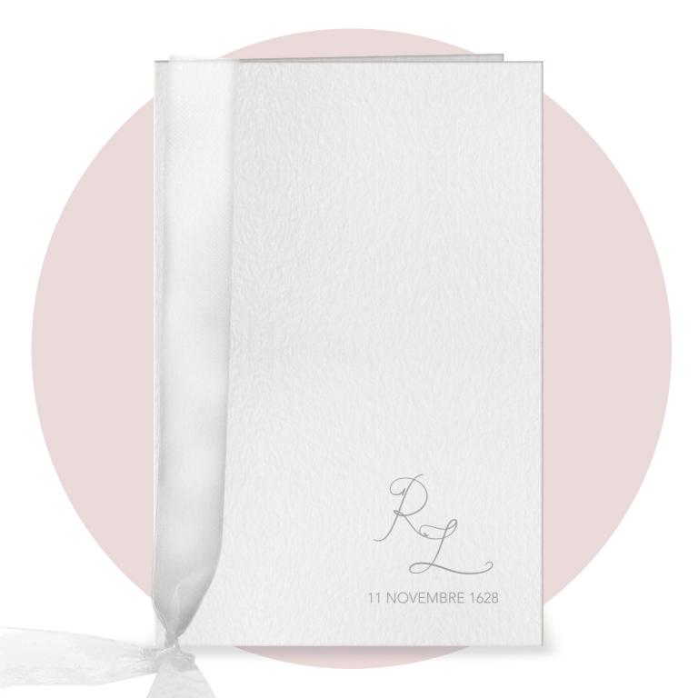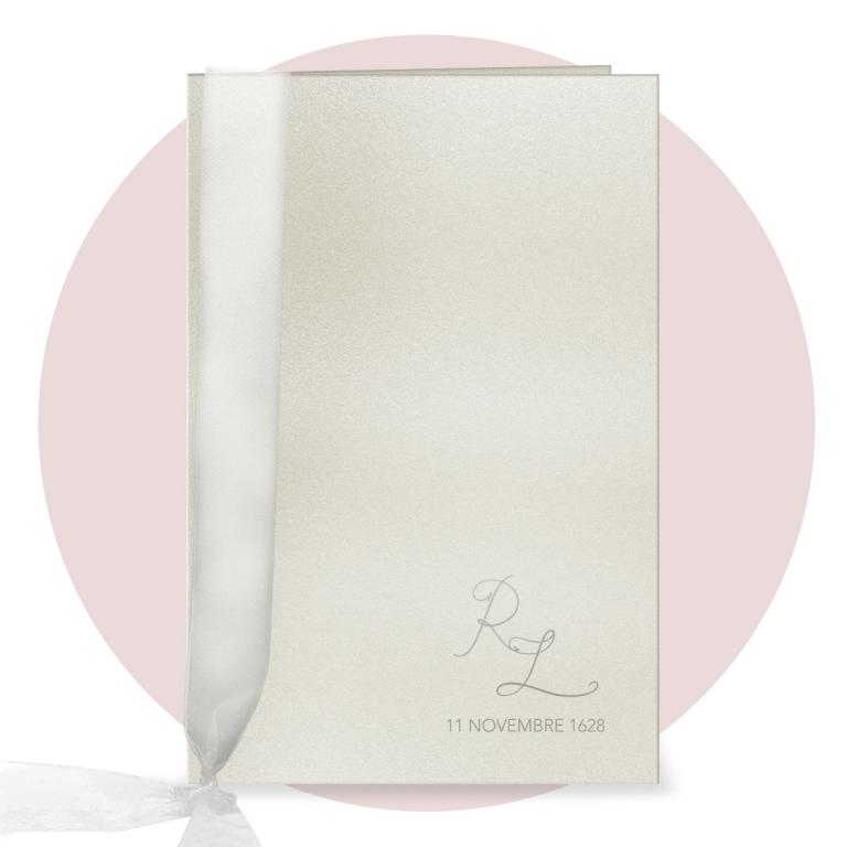 Libretto messa formato A5, spillato in cartoncino pregiato tipo: WILD. Il libretto messa èconposto da interno in carta bianca o avorio 90 gr di 16 facciate, spillato. La copertina collegata all'interno per mezzo di un nastro in organza già compreso. La stampa dell'interno è prevista nera, la stampa a colori della copertina è compresa nel prezzo.