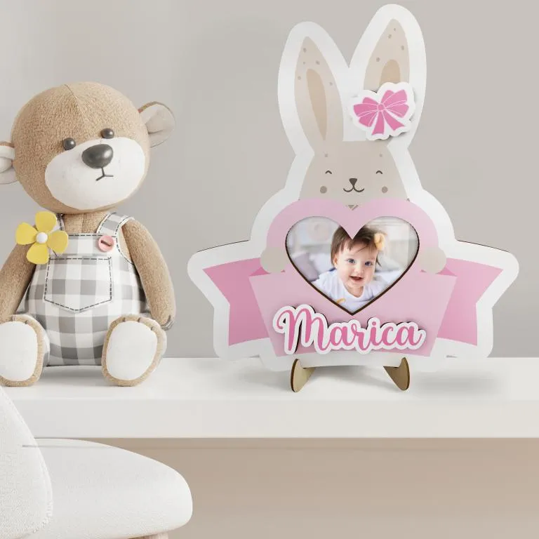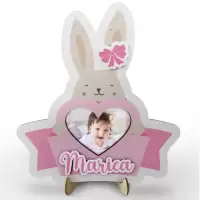 Porta foto realizzato su legno - sagoma e stampa coniglietto, foto a forma di cuore , applicazione di un fiocchetto e personalizzazione applicata con il nome del bambino o bambina. Formato cm 32x29, carta adesiva stampata e accoppiata al legno. Grafica demo modello cod. FPF3-5