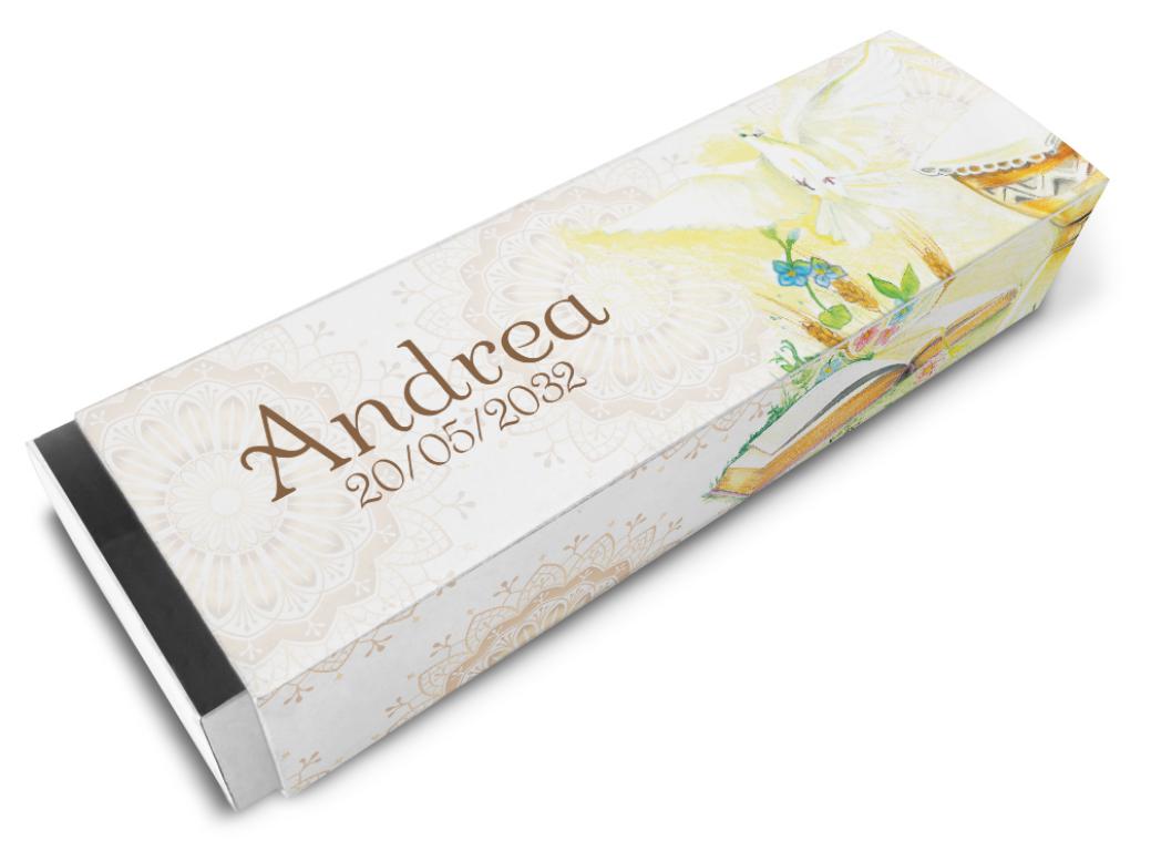 Scatolina porta confetti pre-fustellata e facilissima da montare e personalizzare a casa tua. Ideale per la prima comunione. Istruzioni per il montaggio incluse.