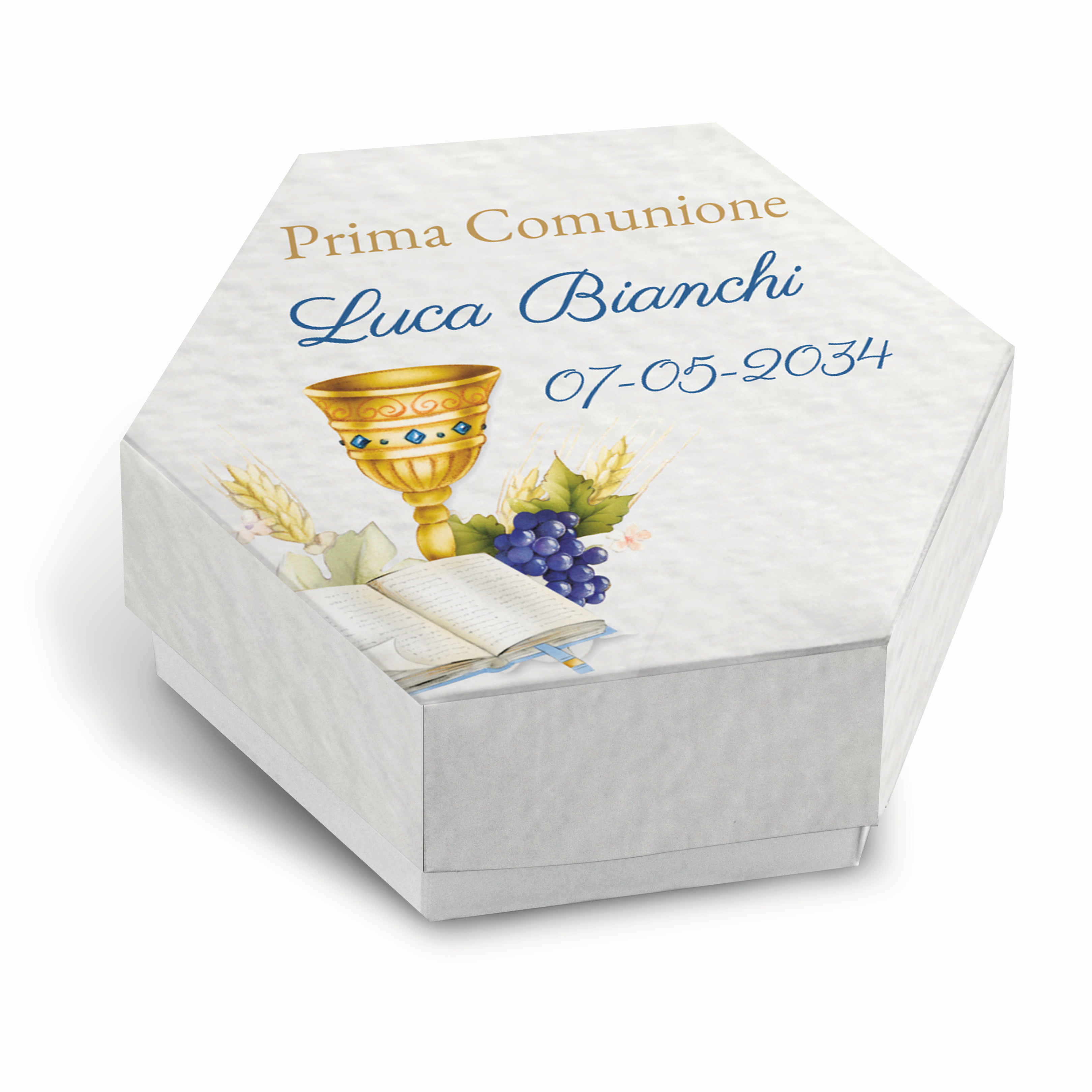 SCATOLINA ESAGONALE PORTA CONFETTI COMUNIONE in cartoncino mono patinato alto spessore. Altissima qualità. - Modello cod: FES-0022