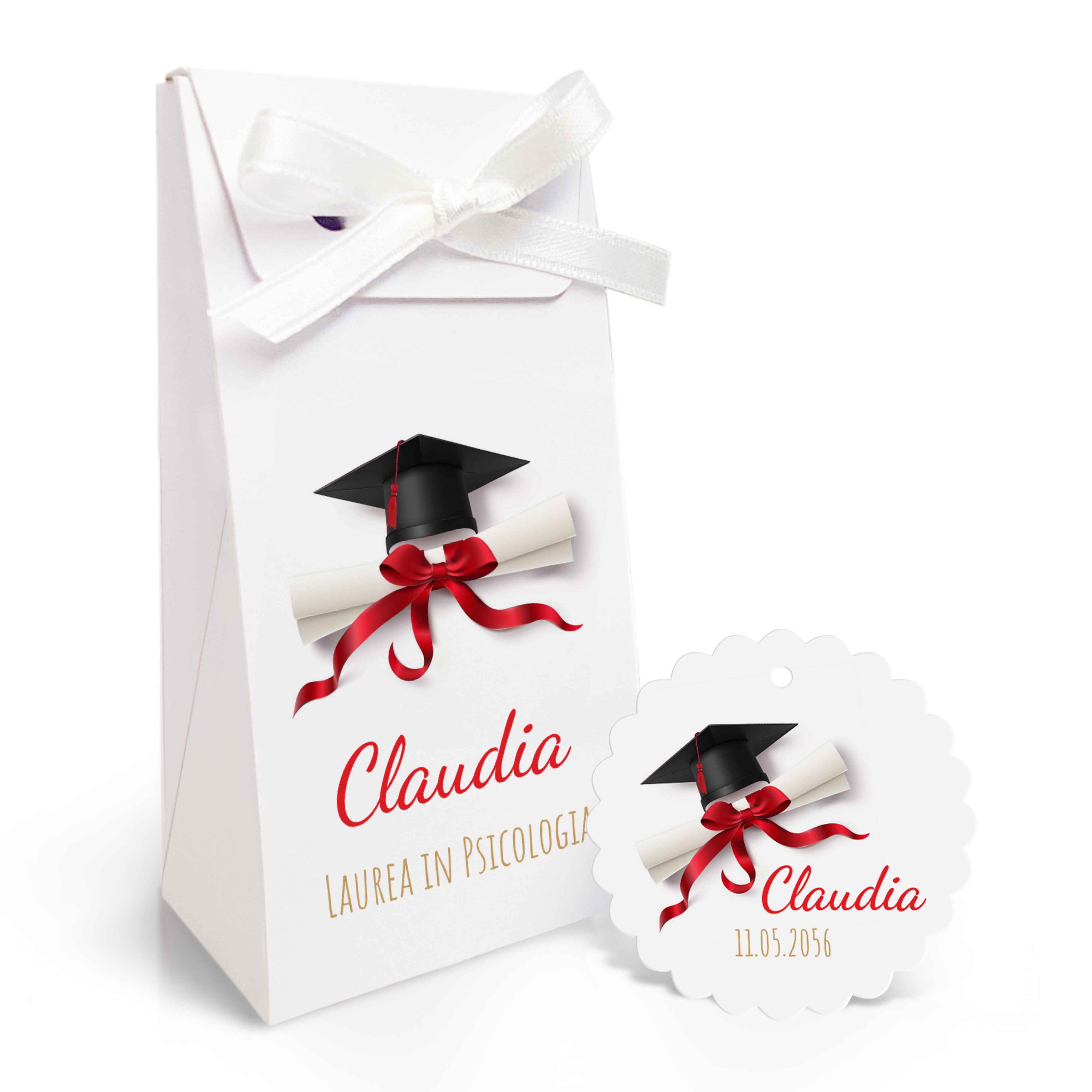SCATOLINA PORTA CONFETTI LAUREA E TAG in cartoncino mono patinato alto spessore. Altissima qualità. - Modello cod: FBUSTAG-3010