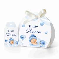 SCATOLINA PORTA CONFETTI NASCITA CELESTE E TAG in cartoncino mono patinato alto spessore. Altissima qualità. - Modello cod: FBOXTAG2011