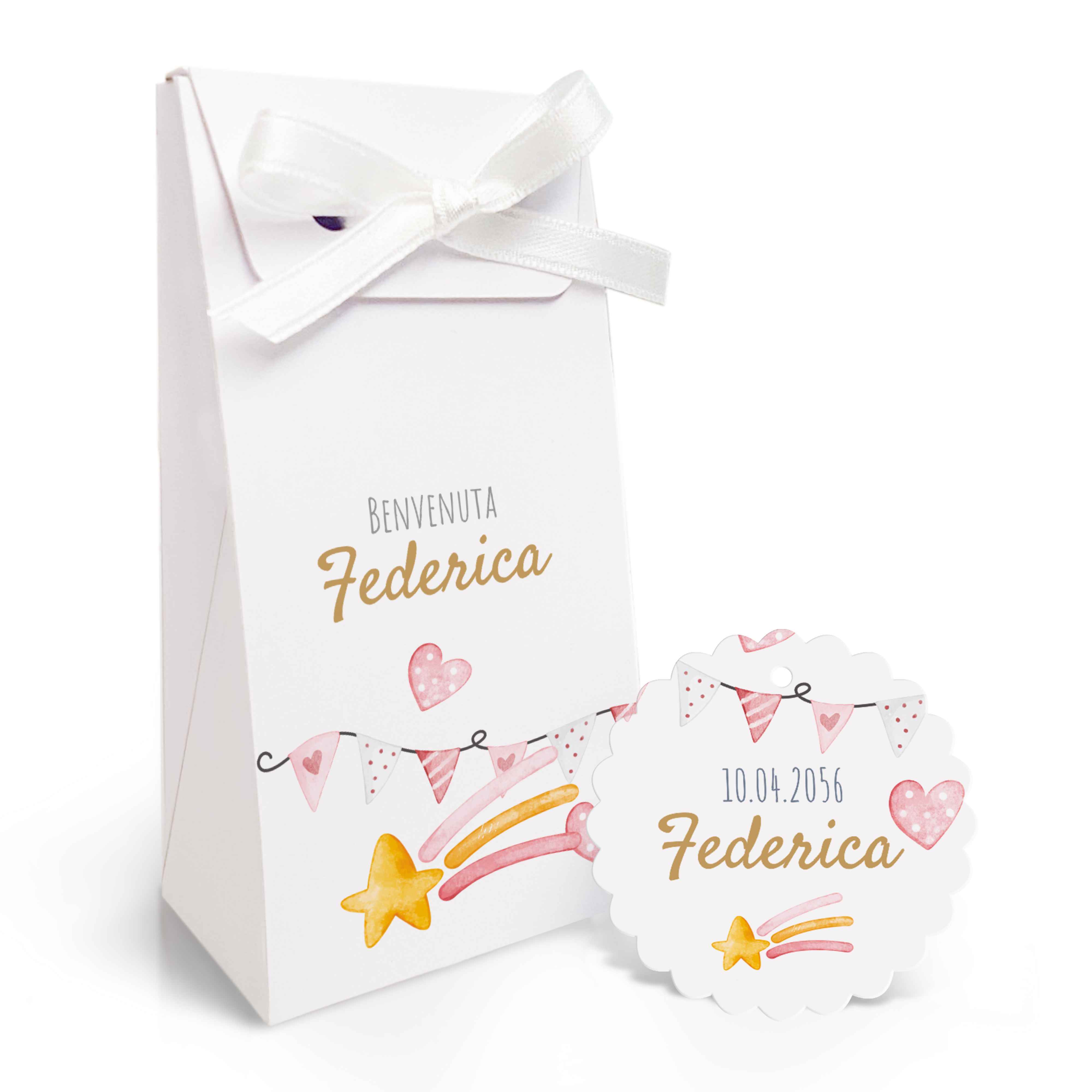 SCATOLINA PORTA CONFETTI NASCITA E TAG in cartoncino mono patinato alto spessore. Altissima qualità. - Modello cod: FBUSTAG-2006