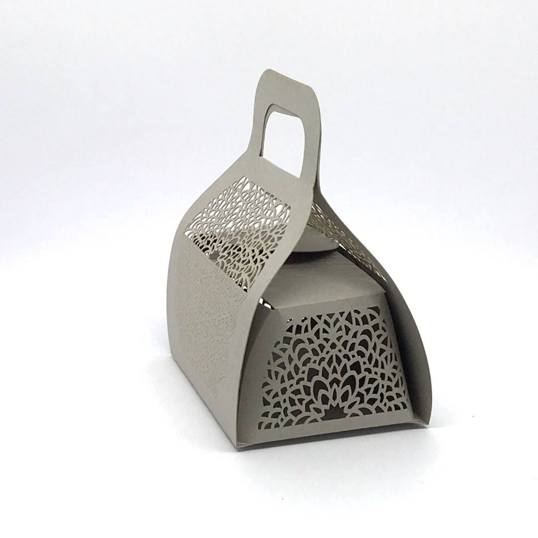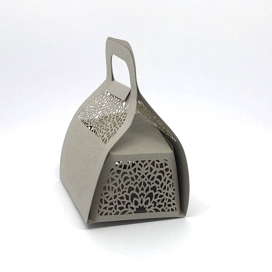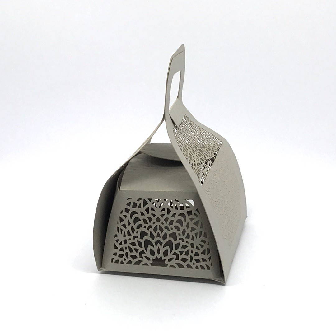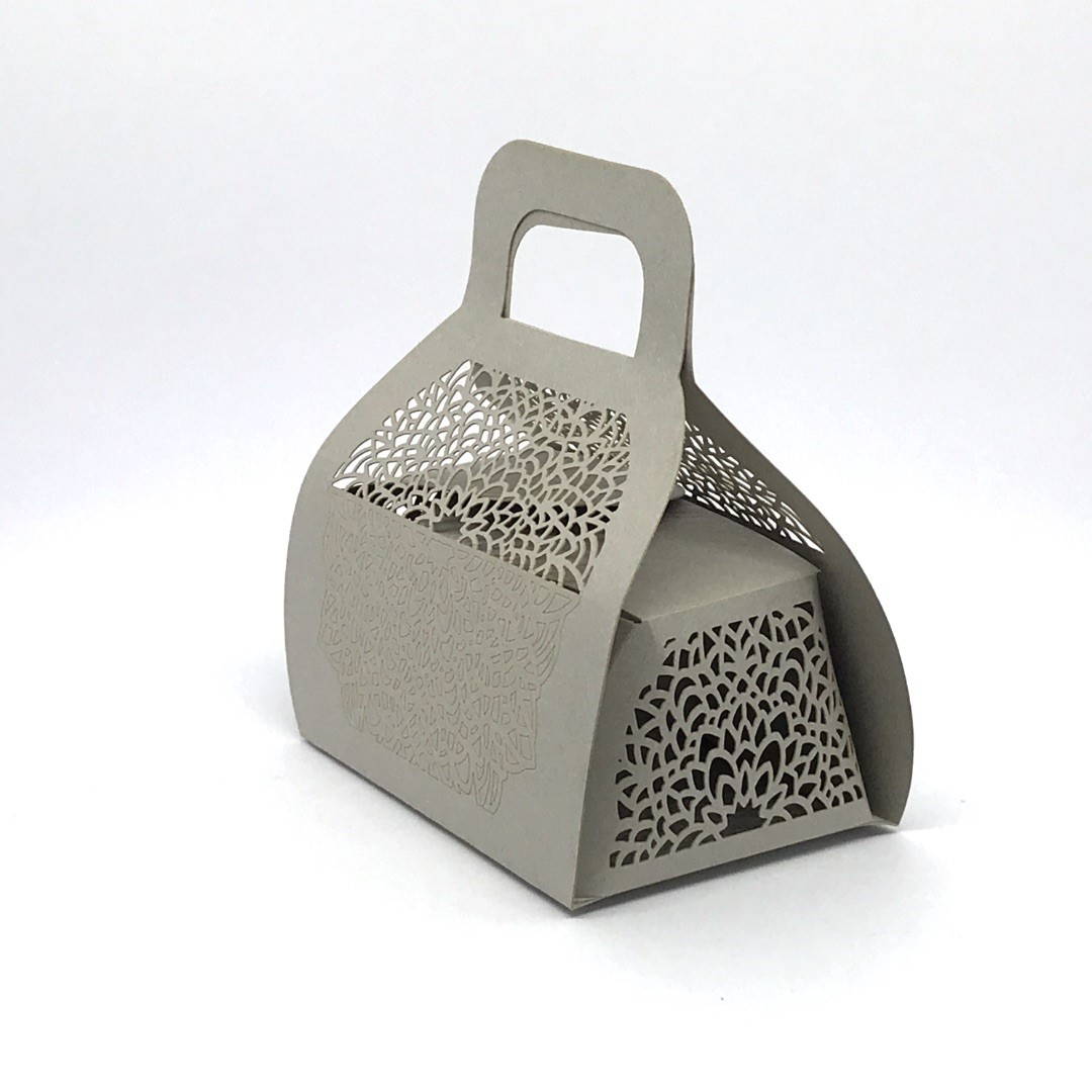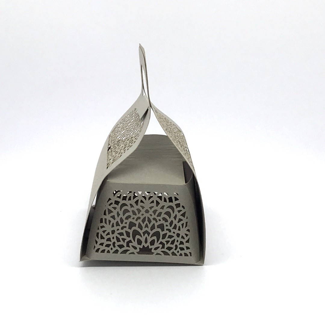 Scatolina in carta sabbia opaca con decoro barocco a taglio laser su parte dei laterali del prodotto