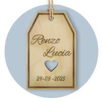 Tag con foro realizzato su legno per bomboniere o segnaposti, personalizzato con nomi sposi, data matrimonio e cuoricino intagliato a laser. Ideale per matrimonio.