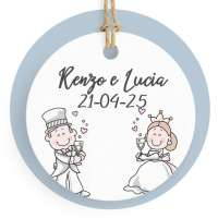 Tag tondo con foro realizzato su carta bianca liscia, stampa di sposini che brindano, ideale per matrimonio.