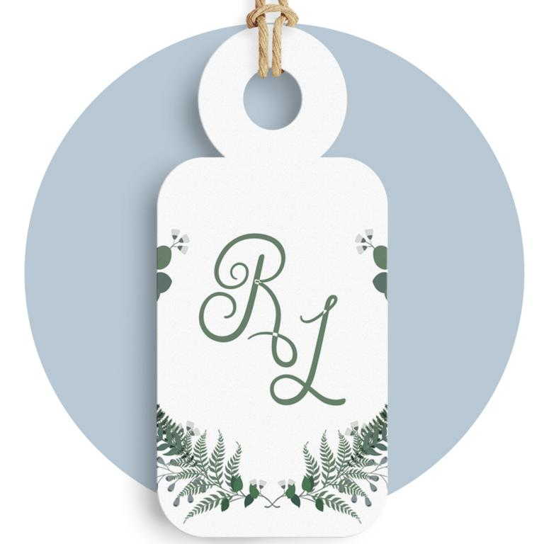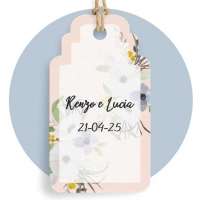 Tag sagomato con foro realizzato su carta bianca liscia, stampa a colori di fiori in trasparenza, ideale per matrimonio.
