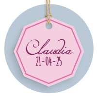 Tag sagomato in forma esagonale realizzato su carta bianca prefustellato in formato A4, stampa bordino fucsia su sfondo rosa, ideale per battesimo o nascita femminuccia.