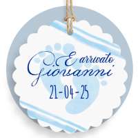 Tag sagomato forma fiore realizzato su carta bianca e prefustellato in formato A4, impronta piedini stampati in celeste, ideale nascita maschietto.