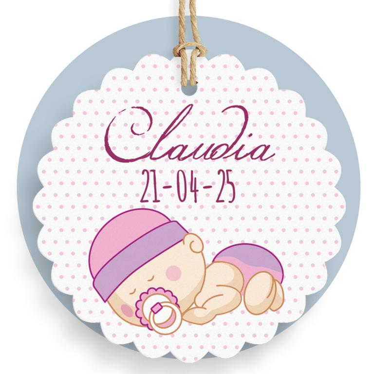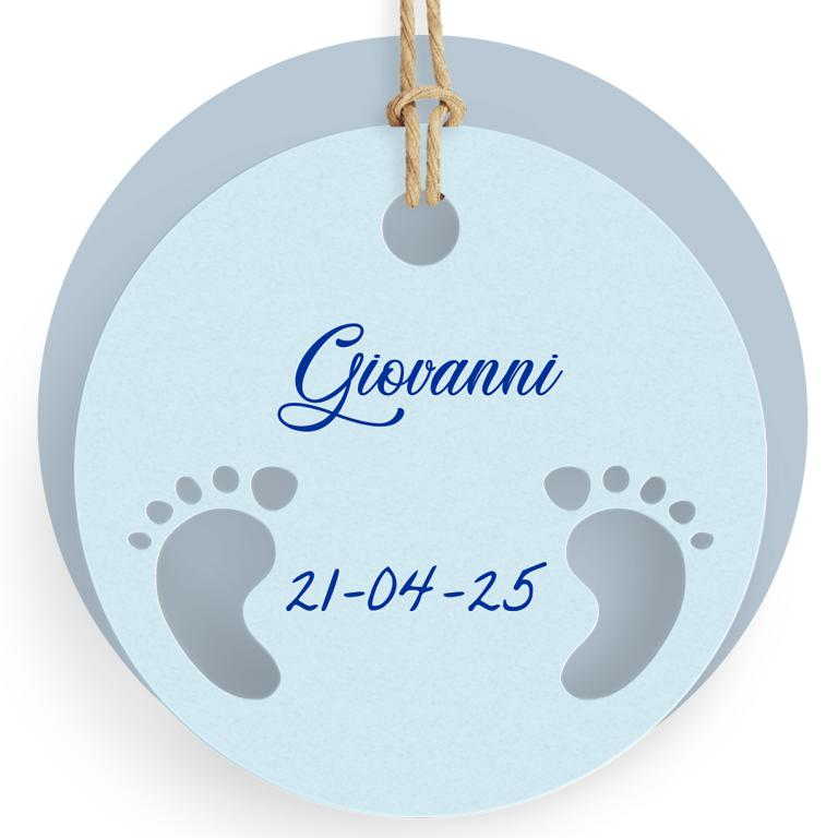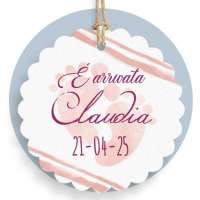 Tag sagomato forma fiore realizzato su carta bianca e prefustellato in formato A4, impronta piedini stampati in rosa, ideale nascita femminuccia.