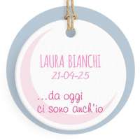 Tag tondo con foro realizzato su carta bianca liscia, mezza luna stampata in rosa e scritta "...da oggi ci sono anch'io" , ideale per nascita femminuccia.