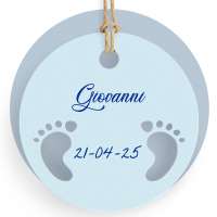Tag tondo realizzato su carta bianca e prefustellato in formato A4, stampa fondo colorato in celeste e piedini intagliati a laser, ideale per nascita maschietto.