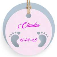 Tag tondo realizzato su carta bianca e prefustellato in formato A4, stampa fondo colorato in rosa e piedini intagliati a laser, ideale per nascita femminuccia.