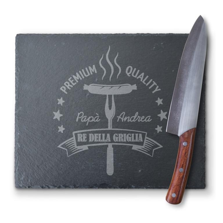 Festa del papà - Tagliere in ardesia rettangolare. Scritta incisa a laser "Chef Master Papà" e personalizzazione con nome del papà. Disegno stilizzato inciso a laser Toque e utensili.